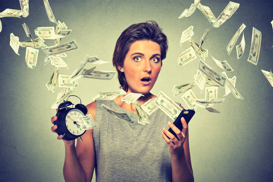 Surprised young woman with alarm clock and smart phone and dollar banknotes bills flying away isolated on gray wall background. Face expression. Online income business concept